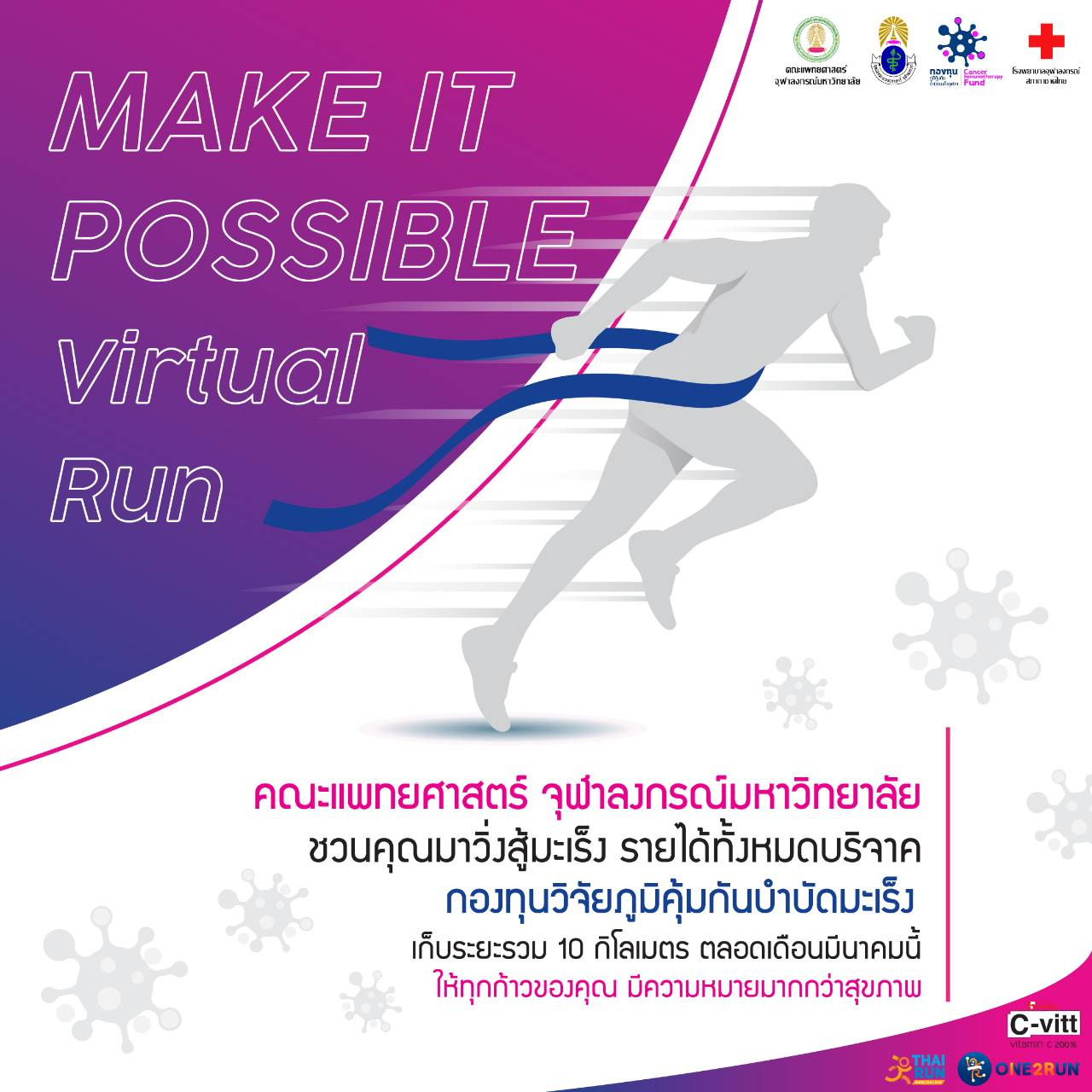 ให้ทุกก้าวของคุณ…มีความหมายมากกว่าสุขภาพ โดยกองทุนภูมิคุ้มกันบำบัดมะเร็ง คณะแพทยศาสตร์ จุฬาลงกรณ์มหาวิทยาลัย ขอเชิญชวนพี่น้องคนไทยทุกคน ร่วมเป็นส่วนหนึ่งในการสมทบทุนขับเคลื่อนงานวิจัย เพื่อเพิ่มทางเลือกให้แก่ผู้ป่วยมะเร็งในราคาที่เข้าถึงได้ โดยรายได้ทั้งหมด จะร่วมสมทบกองทุนภูมิคุ้มกันบำบัดมะเร็ง คณะแพทยศาสตร์ จุฬาลงกรณ์มหาวิทยาลัย